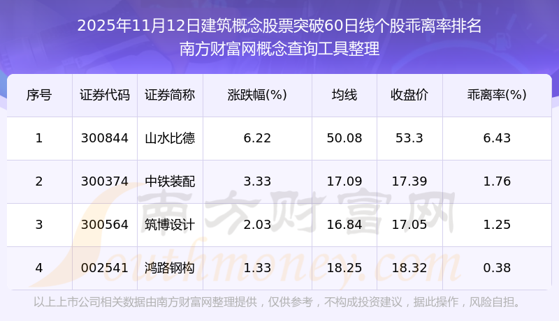 2025年11月12日建筑概念股票突破60日線個(gè)股乖離率排名