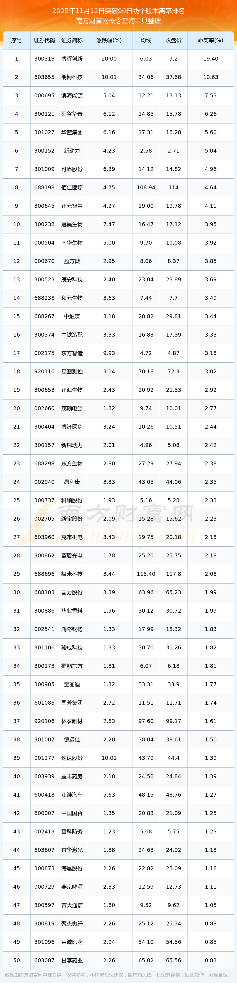 根據(jù)南方財富網(wǎng)概念查詢工具數(shù)據(jù)統(tǒng)計,截止2025年11月12日收盤,共有56只個股收盤價向上突破了90日線,其中乖離率較大的個股有博暉創(chuàng)新、朗博科技、濱海能源、陽谷華泰、華藍(lán)集團(tuán)等,乖離率分別為19.40%、10.63%、7.53%、6.26%、5.60%。