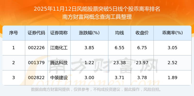 根據(jù)南方財富網(wǎng)概念查詢工具數(shù)據(jù)統(tǒng)計,截止2025年11月12日收盤,風能股票共有3只個股收盤價向上突破了5日線。其中乖離率較大的個股有江南化工、騰達科技、中裝建設等,乖離率分別為3.05%、2.52%、1.89%。