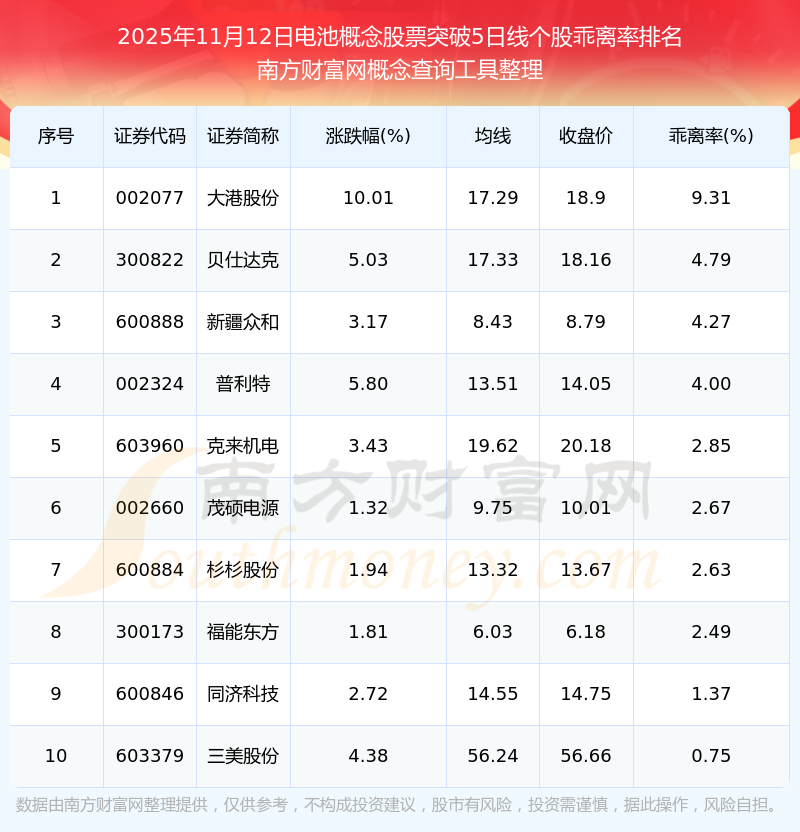 根據(jù)南方財(cái)富網(wǎng)概念查詢工具數(shù)據(jù)統(tǒng)計(jì),截止2025年11月12日收盤,電池概念股票共有10只個(gè)股收盤價(jià)向上突破了5日線。其中乖離率較大的個(gè)股有大港股份、貝仕達(dá)克、新疆眾和等,乖離率分別為9.31%、4.79%、4.27%。