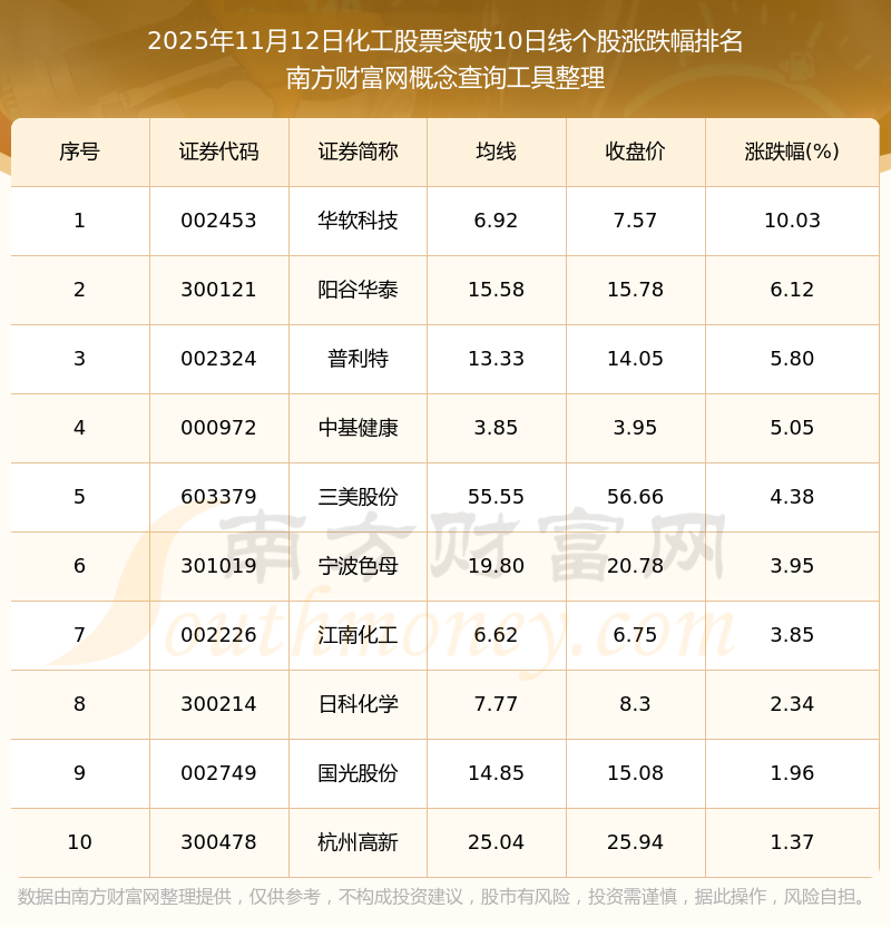 2025年11月12日化工股票突破10日線個股漲跌幅排名