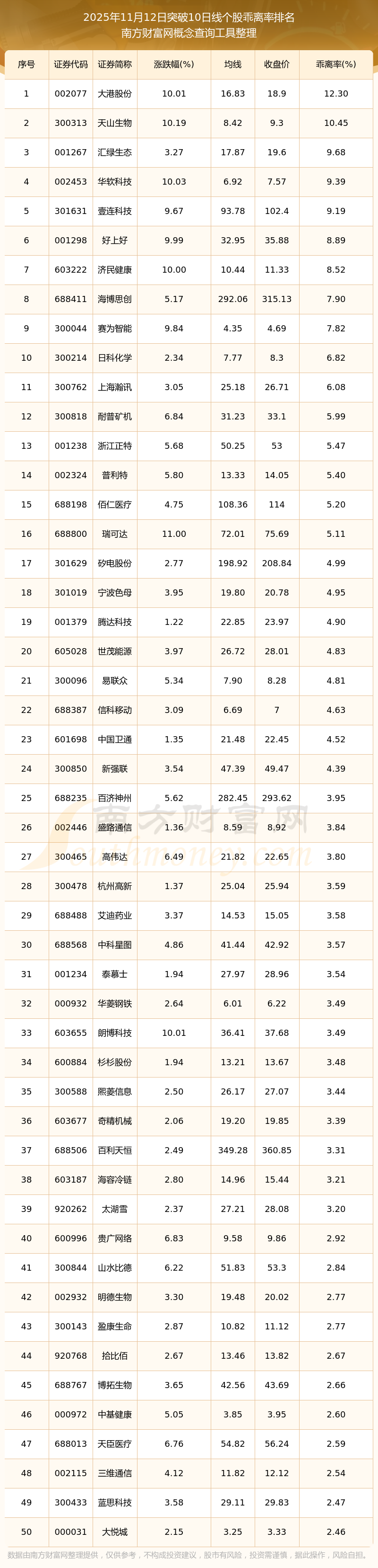 根據(jù)南方財(cái)富網(wǎng)概念查詢工具數(shù)據(jù)統(tǒng)計(jì),截止2025年11月12日收盤,共有103只個股收盤價向上突破了10日線,其中乖離率較大的個股有大港股份、天山生物、匯綠生態(tài)、華軟科技、壹連科技等,乖離率分別為12.30%、10.45%、9.68%、9.39%、9.19%。