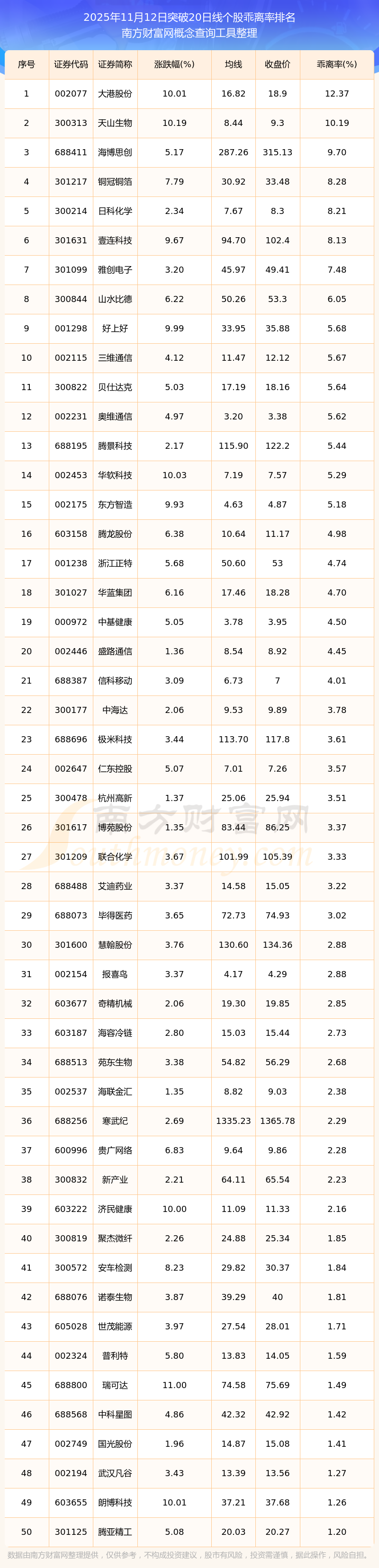 根據(jù)南方財富網(wǎng)概念查詢工具數(shù)據(jù)統(tǒng)計,截止2025年11月12日收盤,共有81只個股收盤價向上突破了20日線,其中乖離率較大的個股有大港股份、天山生物、海博思創(chuàng)、銅冠銅箔、日科化學(xué)等,乖離率分別為12.37%、10.19%、9.70%、8.28%、8.21%。