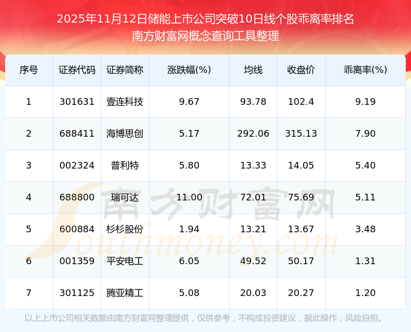 2025年11月12日儲能上市公司突破10日線個股乖離率排名