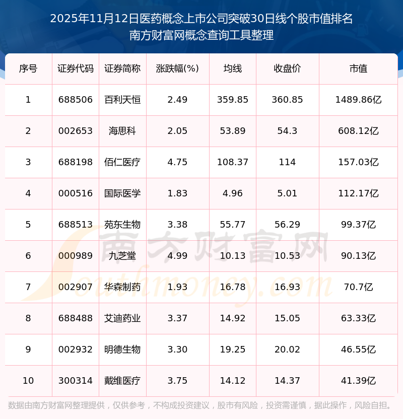 2025年11月12日醫(yī)藥概念上市公司突破30日線個股市值排名