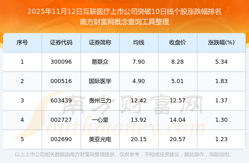 2025年11月12日互聯(lián)醫(yī)療上市公司突破10日線個(gè)股漲跌幅排名
