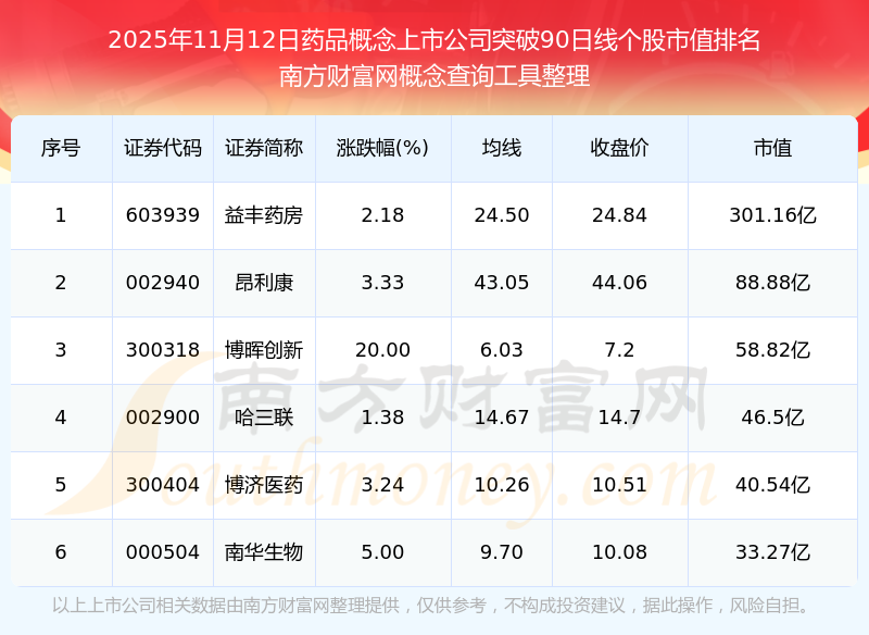 根據(jù)南方財(cái)富網(wǎng)概念查詢工具數(shù)據(jù)統(tǒng)計(jì),截止2025年11月12日收盤,藥品概念上市公司共有6只個(gè)股收盤價(jià)向上突破了90日線。其中市值較大的個(gè)股有益豐藥房、昂利康、博暉創(chuàng)新等,市值分別為301.16億、88.88億、58.82億。