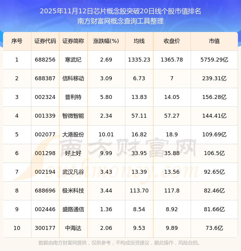 2025年11月12日芯片概念股突破20日線個股市值排名