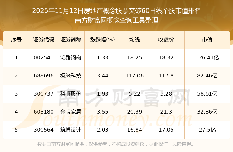 根據南方財富網概念查詢工具數據統(tǒng)計,截止2025年11月12日收盤,房地產概念股票共有5只個股收盤價向上突破了60日線。其中市值較大的個股有鴻路鋼構、極米科技、科順股份等,市值分別為126.41億、82.46億、58.61億。