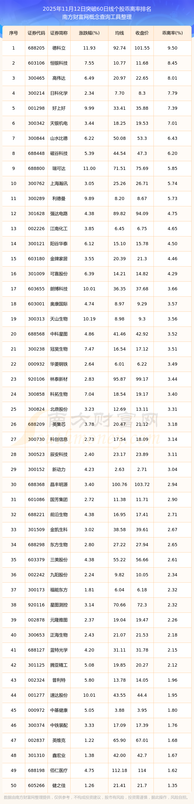 根據南方財富網概念查詢工具數(shù)據統(tǒng)計,截止2025年11月12日收盤,共有77只個股收盤價向上突破了60日線,其中乖離率較大的個股有德科立、恒銀科技、高偉達、日科化學、好上好等,乖離率分別為9.50%、8.45%、8.01%、7.79%、7.39%。
