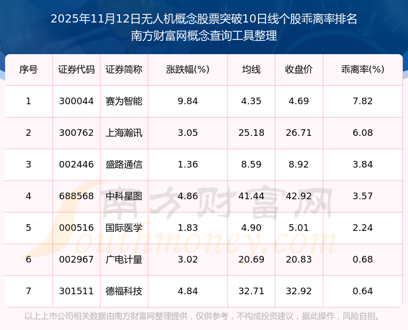 2025年11月12日無人機(jī)概念股票突破10日線個(gè)股乖離率排名
