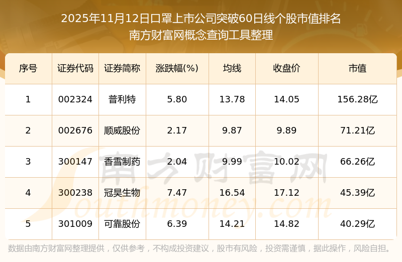 2025年11月12日口罩上市公司突破60日線個(gè)股市值排名