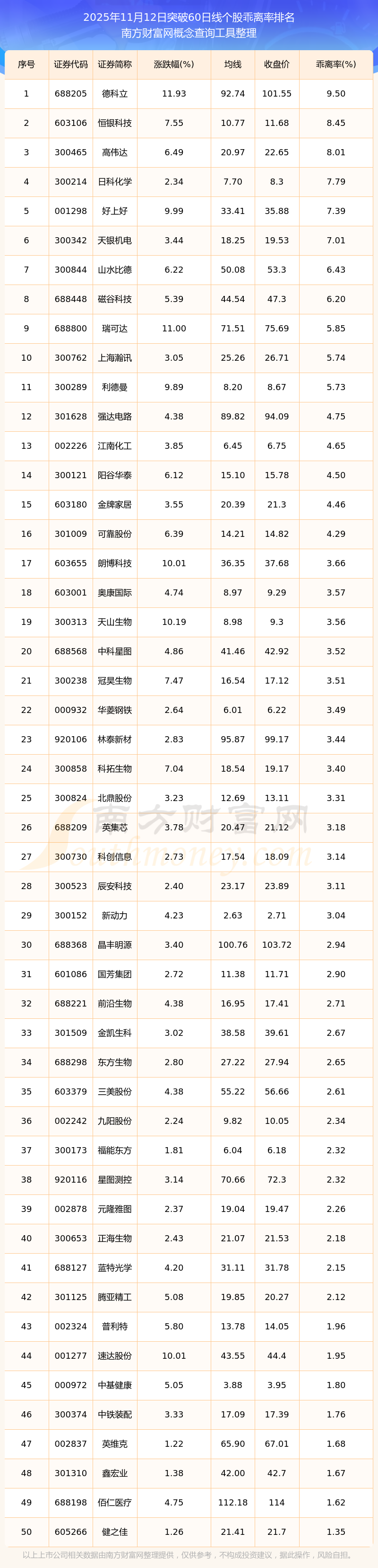根據(jù)南方財富網(wǎng)概念查詢工具數(shù)據(jù)統(tǒng)計,截止2025年11月12日收盤,共有77只個股收盤價向上突破了60日線,其中乖離率較大的個股有德科立、恒銀科技、高偉達、日科化學(xué)、好上好等,乖離率分別為9.50%、8.45%、8.01%、7.79%、7.39%。