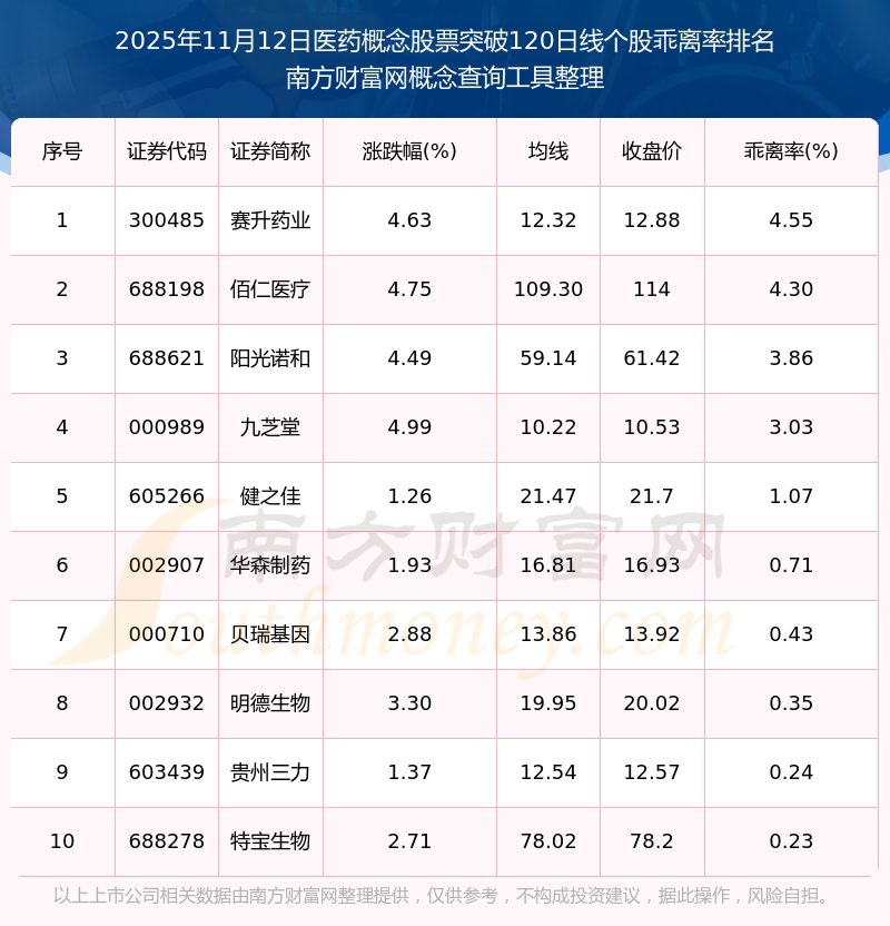 根據(jù)南方財(cái)富網(wǎng)概念查詢工具數(shù)據(jù)統(tǒng)計(jì),截止2025年11月12日收盤,醫(yī)藥概念股票共有10只個(gè)股收盤價(jià)向上突破了120日線。其中乖離率較大的個(gè)股有賽升藥業(yè)、佰仁醫(yī)療、陽(yáng)光諾和等,乖離率分別為4.55%、4.30%、3.86%。