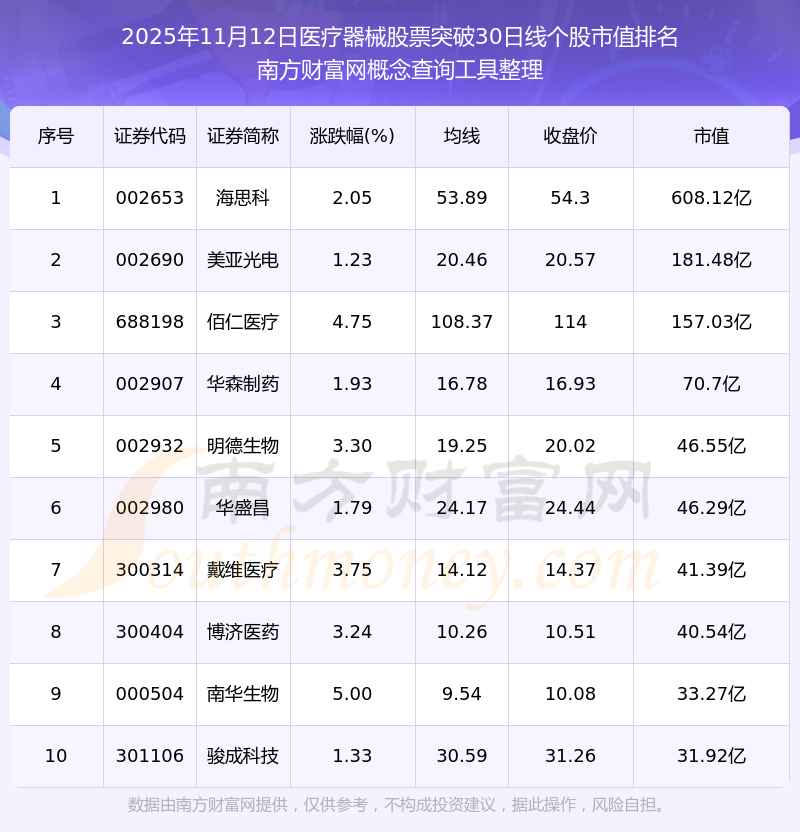 2025年11月12日醫(yī)療器械股票突破30日線個(gè)股市值排名