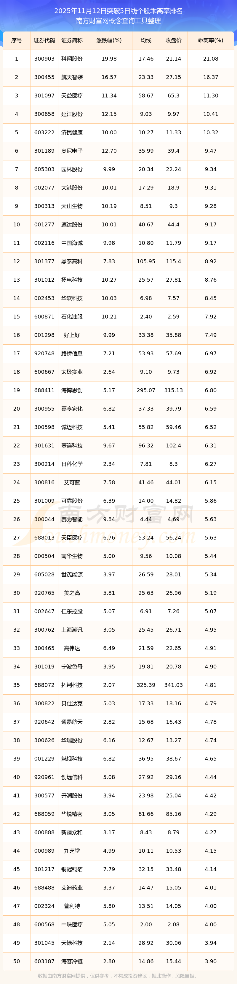 2025年11月12日突破5日線個(gè)股乖離率排名
