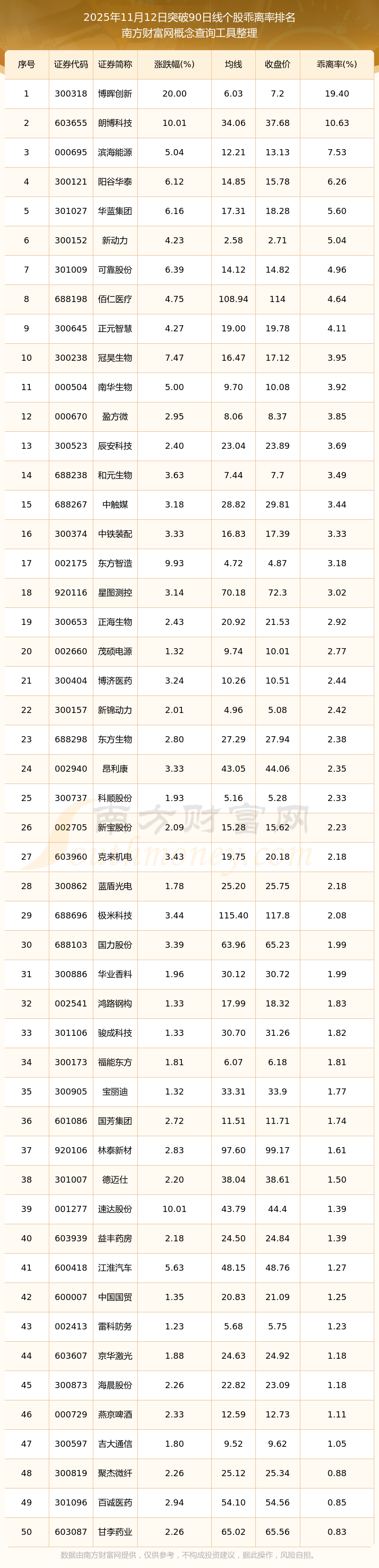 根據(jù)南方財富網(wǎng)概念查詢工具數(shù)據(jù)統(tǒng)計,截止2025年11月12日收盤,共有56只個股收盤價向上突破了90日線,其中乖離率較大的個股有博暉創(chuàng)新、朗博科技、濱海能源、陽谷華泰、華藍(lán)集團等,乖離率分別為19.40%、10.63%、7.53%、6.26%、5.60%。