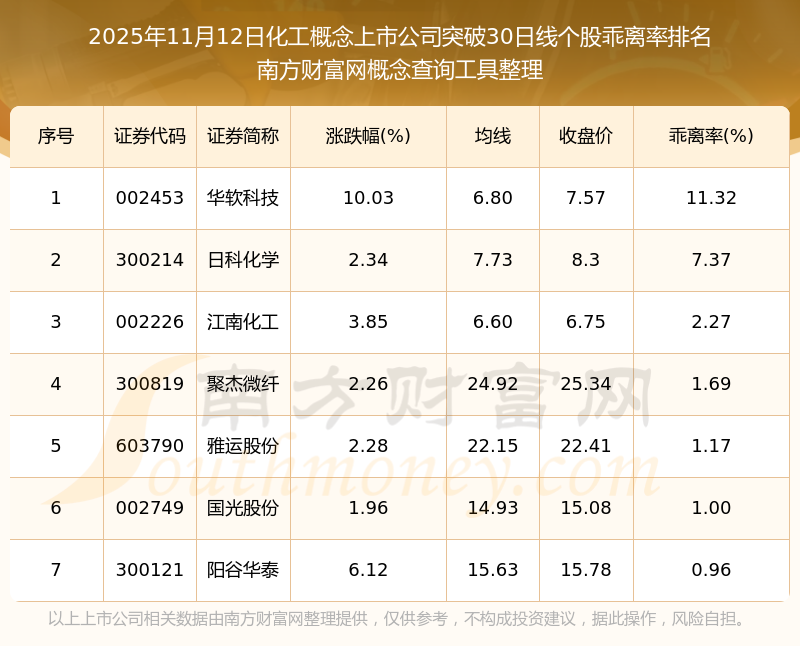 2025年11月12日化工概念上市公司突破30日線個(gè)股乖離率排名