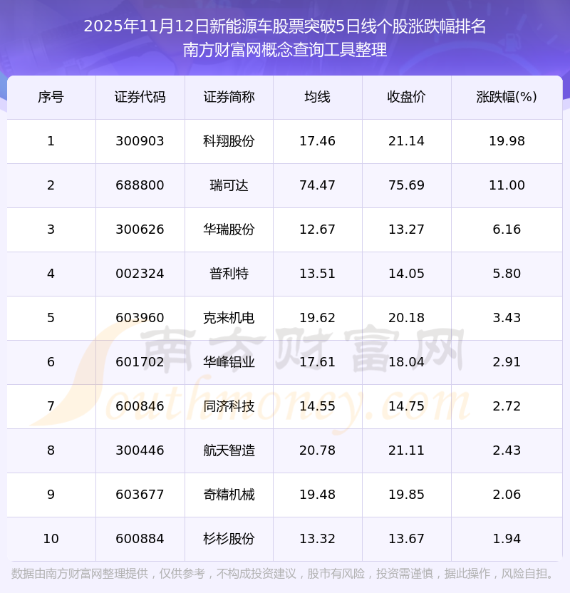 2025年11月12日新能源車股票突破5日線個(gè)股漲跌幅排名