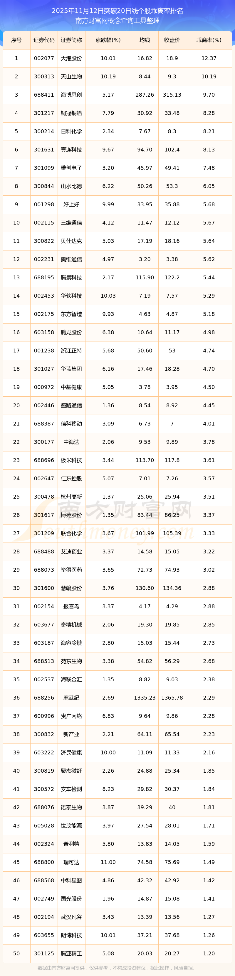 2025年11月12日突破20日線個(gè)股乖離率排名
