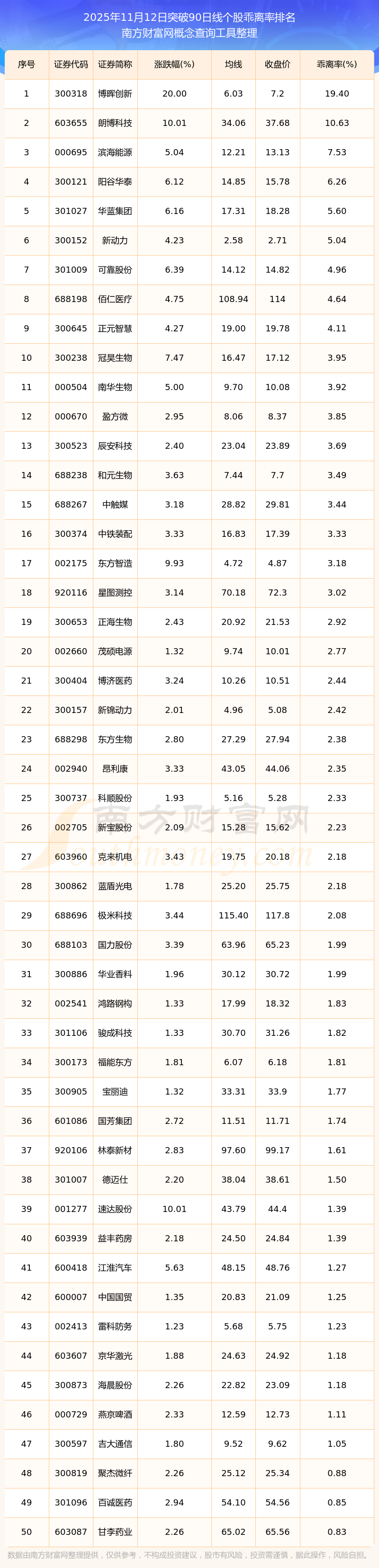 根據(jù)南方財富網(wǎng)概念查詢工具數(shù)據(jù)統(tǒng)計,截止2025年11月12日收盤,共有56只個股收盤價向上突破了90日線,其中乖離率較大的個股有博暉創(chuàng)新、朗博科技、濱海能源、陽谷華泰、華藍集團等,乖離率分別為19.40%、10.63%、7.53%、6.26%、5.60%。