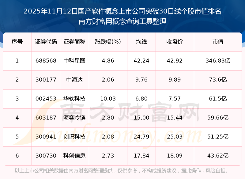 2025年11月12日國產(chǎn)軟件概念上市公司突破30日線個股市值排名
