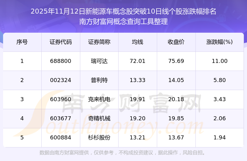 2025年11月12日新能源車概念股突破10日線個(gè)股漲跌幅排名