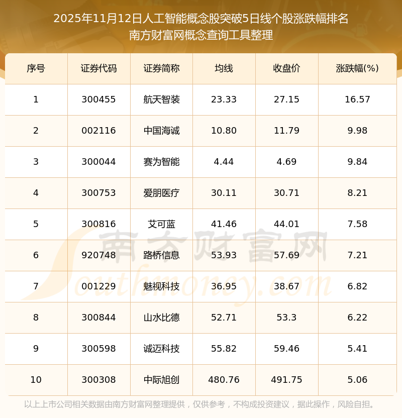 2025年11月12日人工智能概念股突破5日線個股漲跌幅排名