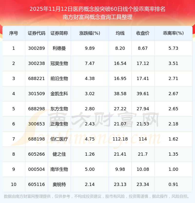 根據(jù)南方財富網(wǎng)概念查詢工具數(shù)據(jù)統(tǒng)計,截止2025年11月12日收盤,醫(yī)藥概念股共有18只個股收盤價向上突破了60日線。其中乖離率較大的個股有利德曼、冠昊生物、前沿生物等,乖離率分別為5.73%、3.51%、2.71%。