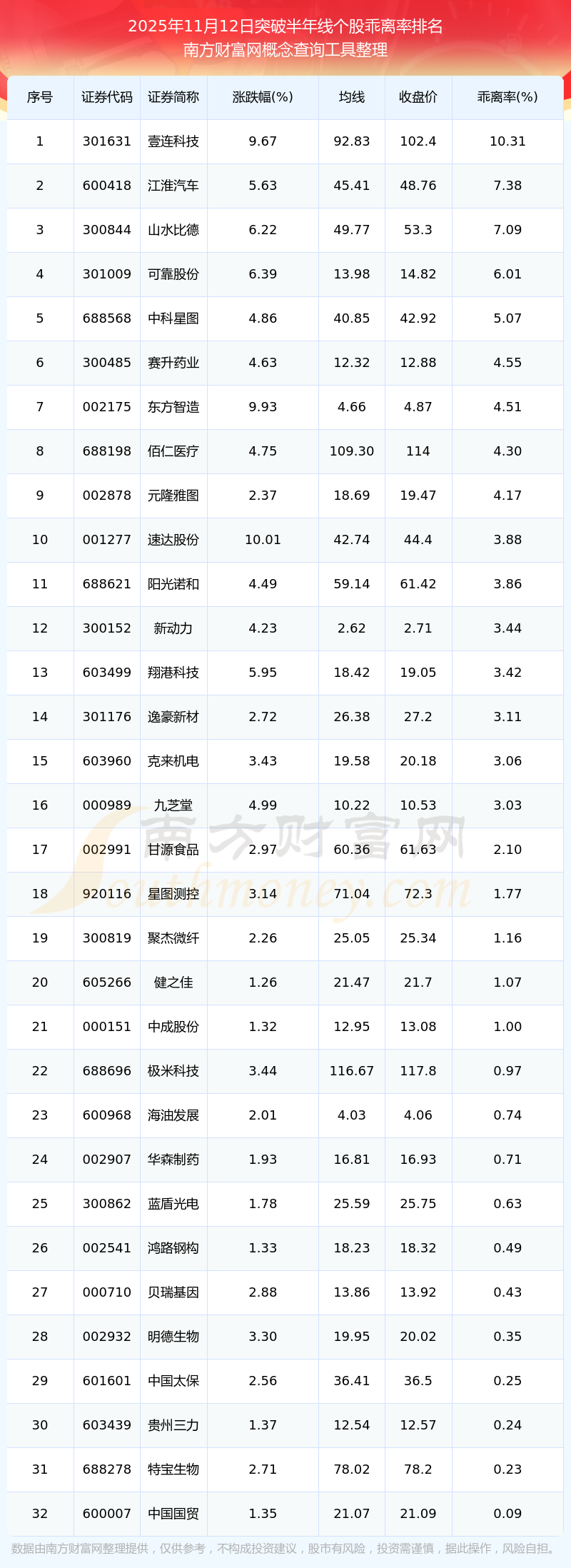 根據(jù)南方財富網(wǎng)概念查詢工具數(shù)據(jù)統(tǒng)計,截止2025年11月12日收盤,共有32只個股收盤價向上突破了120日線,其中乖離率較大的個股有壹連科技、江淮汽車、山水比德、可靠股份、中科星圖等,乖離率分別為10.31%、7.38%、7.09%、6.01%、5.07%。