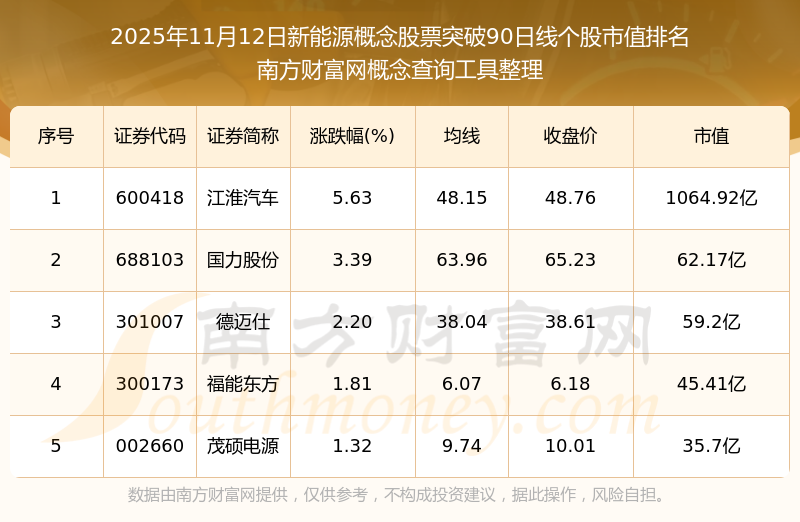 2025年11月12日新能源概念股票突破90日線個股市值排名