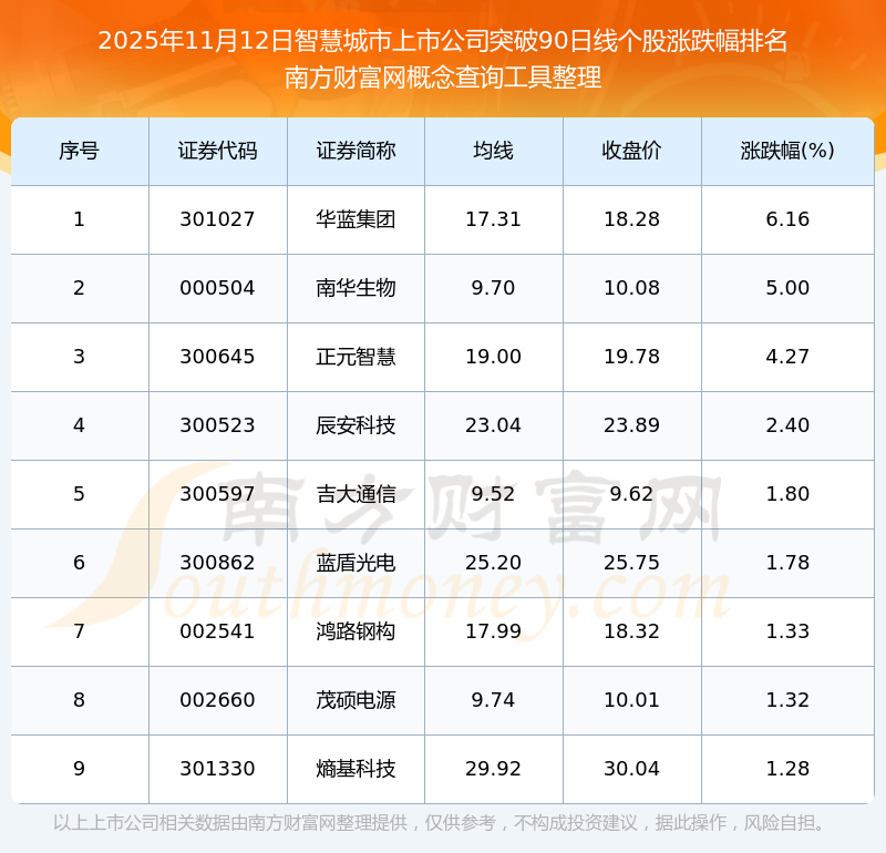 2025年11月12日智慧城市上市公司突破90日線個(gè)股漲跌幅排名