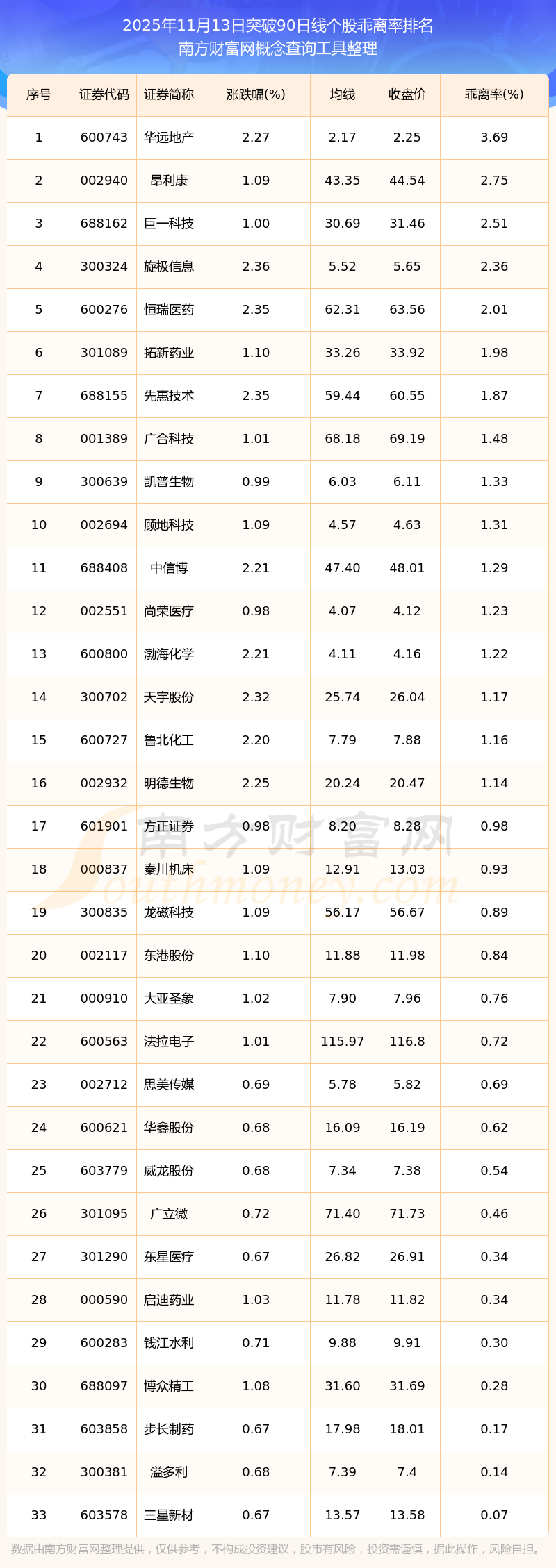 根據(jù)南方財富網(wǎng)概念查詢工具數(shù)據(jù)統(tǒng)計,截止2025年11月13日收盤,共有33只個股收盤價向上突破了90日線,其中乖離率較大的個股有華遠地產(chǎn)、昂利康、巨一科技、旋極信息、恒瑞醫(yī)藥等,乖離率分別為3.69%、2.75%、2.51%、2.36%、2.01%。