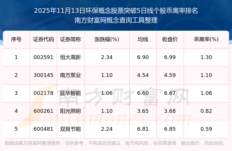 根據南方財富網概念查詢工具數據統(tǒng)計,截止2025年11月13日收盤,環(huán)保概念股票共有5只個股收盤價向上突破了5日線。其中乖離率較大的個股有恒大高新、南方泵業(yè)、延華智能等,乖離率分別為1.30%、1.10%、1.06%。