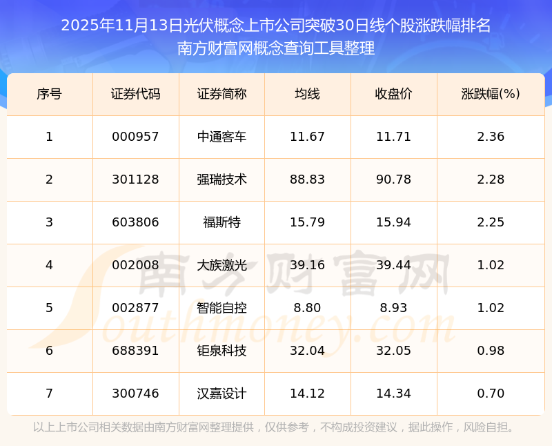 根據南方財富網概念查詢工具數(shù)據統(tǒng)計,截止2025年11月13日收盤,光伏概念上市公司共有7只個股收盤價向上突破了30日線。其中漲幅較大的個股有中通客車、強瑞技術、福斯特等,漲幅分別為2.36%、2.28%、2.25%。
