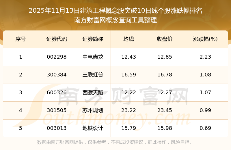 2025年11月13日建筑工程概念股突破10日線個股漲跌幅排名