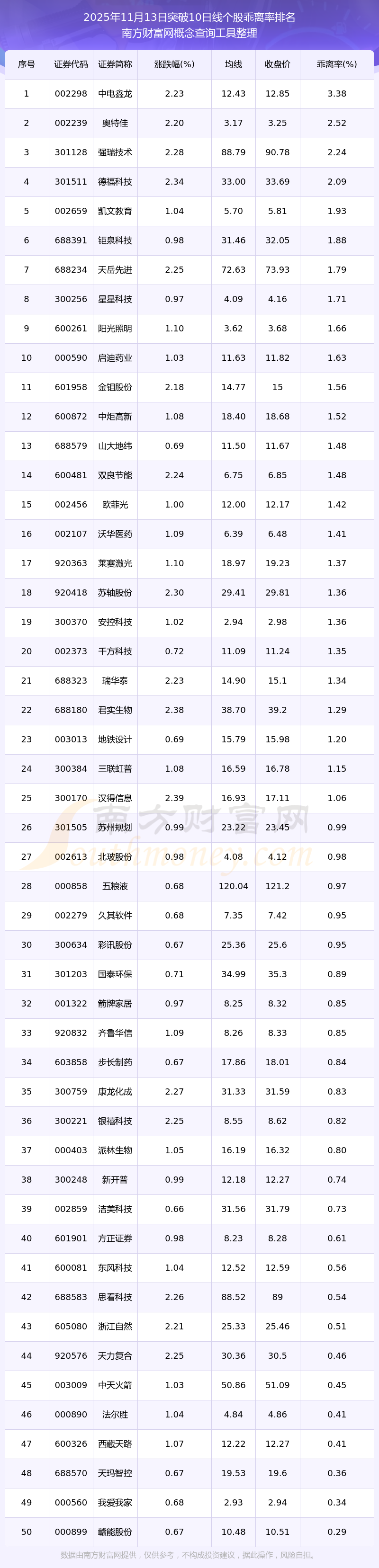 2025年11月13日突破10日線個(gè)股乖離率排名