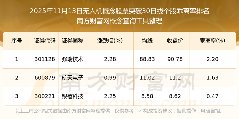 2025年11月13日無(wú)人機(jī)概念股票突破30日線個(gè)股乖離率排名