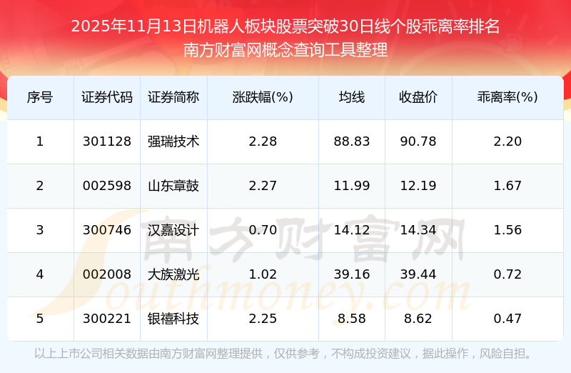 根據(jù)南方財(cái)富網(wǎng)概念查詢工具數(shù)據(jù)統(tǒng)計(jì),截止2025年11月13日收盤,機(jī)器人板塊股票共有5只個股收盤價向上突破了30日線。其中乖離率較大的個股有強(qiáng)瑞技術(shù)、山東章鼓、漢嘉設(shè)計(jì)等,乖離率分別為2.20%、1.67%、1.56%。