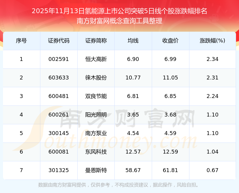 2025年11月13日氫能源上市公司突破5日線個(gè)股漲跌幅排名