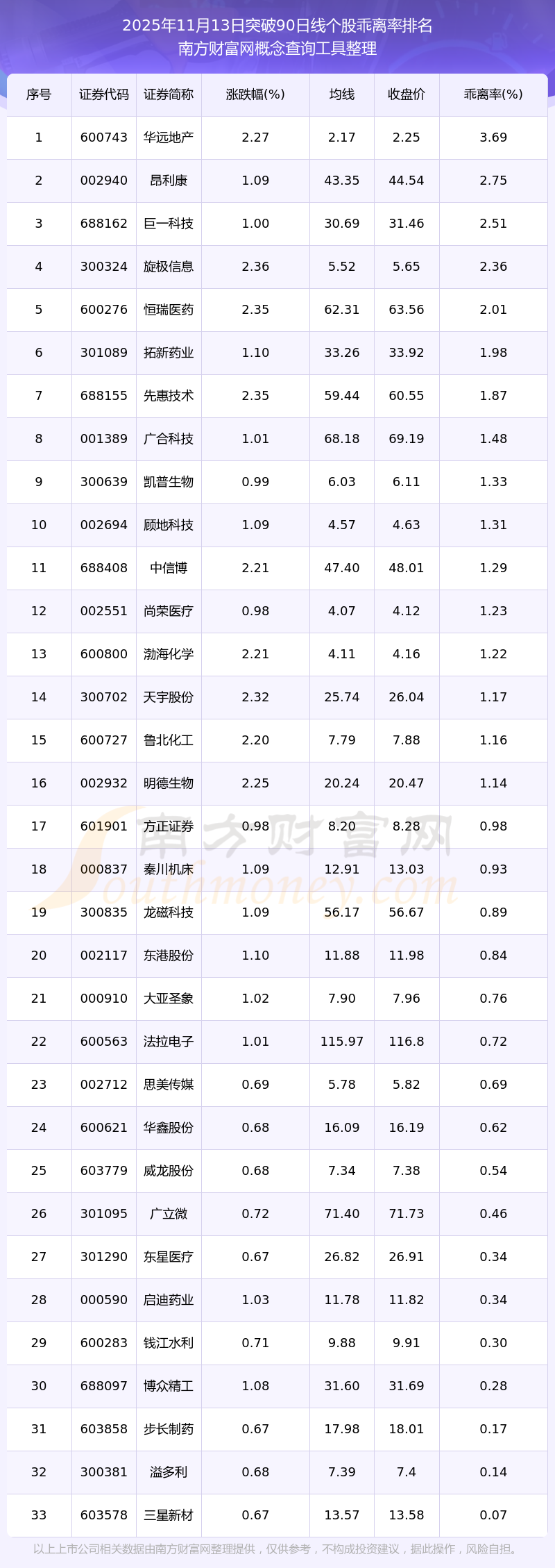根據(jù)南方財富網(wǎng)概念查詢工具數(shù)據(jù)統(tǒng)計,截止2025年11月13日收盤,共有33只個股收盤價向上突破了90日線,其中乖離率較大的個股有華遠地產(chǎn)、昂利康、巨一科技、旋極信息、恒瑞醫(yī)藥等,乖離率分別為3.69%、2.75%、2.51%、2.36%、2.01%。
