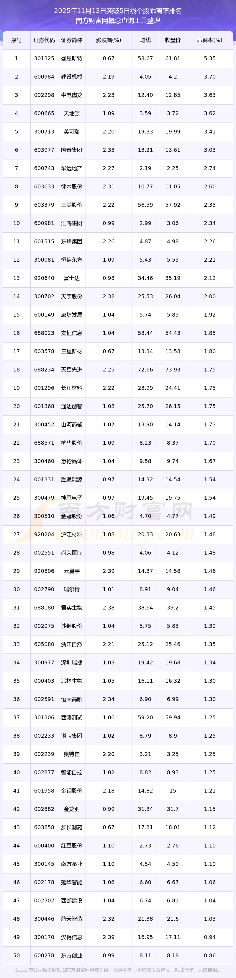 2025年11月13日突破5日線(xiàn)個(gè)股乖離率排名