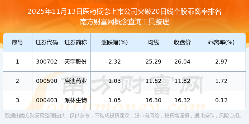 2025年11月13日醫(yī)藥概念上市公司突破20日線個(gè)股乖離率排名
