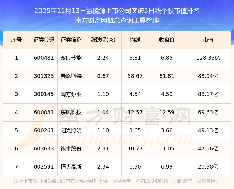2025年11月13日氫能源上市公司突破5日線個(gè)股市值排名