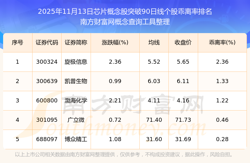根據南方財富網概念查詢工具數據統(tǒng)計,截止2025年11月13日收盤,芯片概念股共有5只個股收盤價向上突破了90日線。其中乖離率較大的個股有旋極信息、凱普生物、渤;瘜W等,乖離率分別為2.36%、1.33%、1.22%。