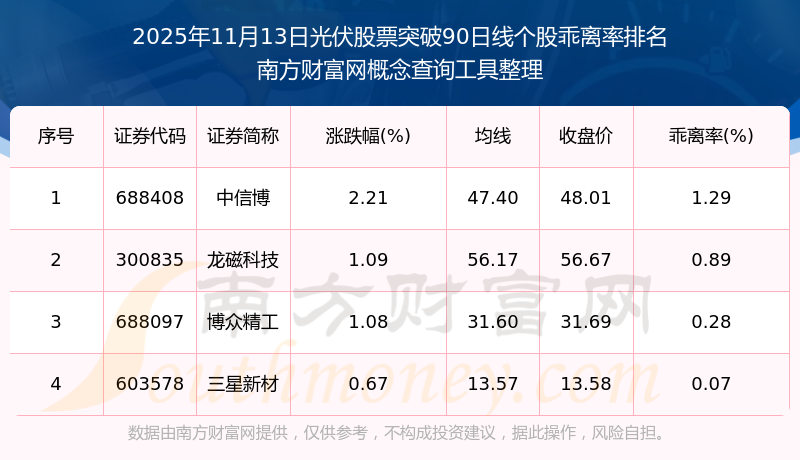 根據(jù)南方財(cái)富網(wǎng)概念查詢工具數(shù)據(jù)統(tǒng)計(jì),截止2025年11月13日收盤,光伏股票共有4只個(gè)股收盤價(jià)向上突破了90日線。其中乖離率較大的個(gè)股有中信博、龍磁科技、博眾精工等,乖離率分別為1.29%、0.89%、0.28%。