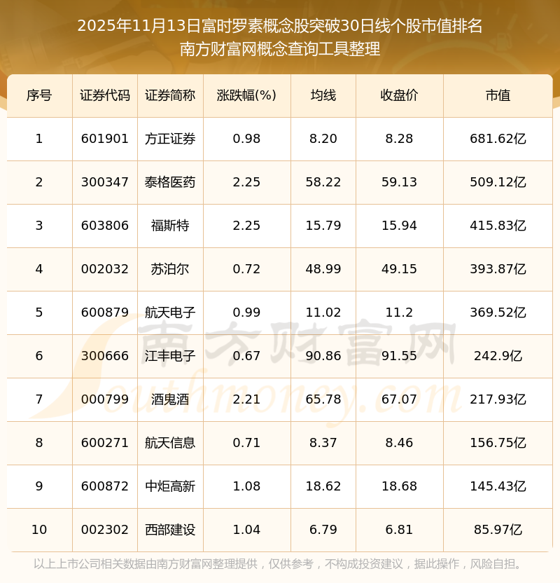 根據(jù)南方財富網(wǎng)概念查詢工具數(shù)據(jù)統(tǒng)計,截止2025年11月13日收盤,富時羅素概念股共有11只個股收盤價向上突破了30日線。其中市值較大的個股有方正證券、泰格醫(yī)藥、福斯特等,市值分別為681.62億、509.12億、415.83億。