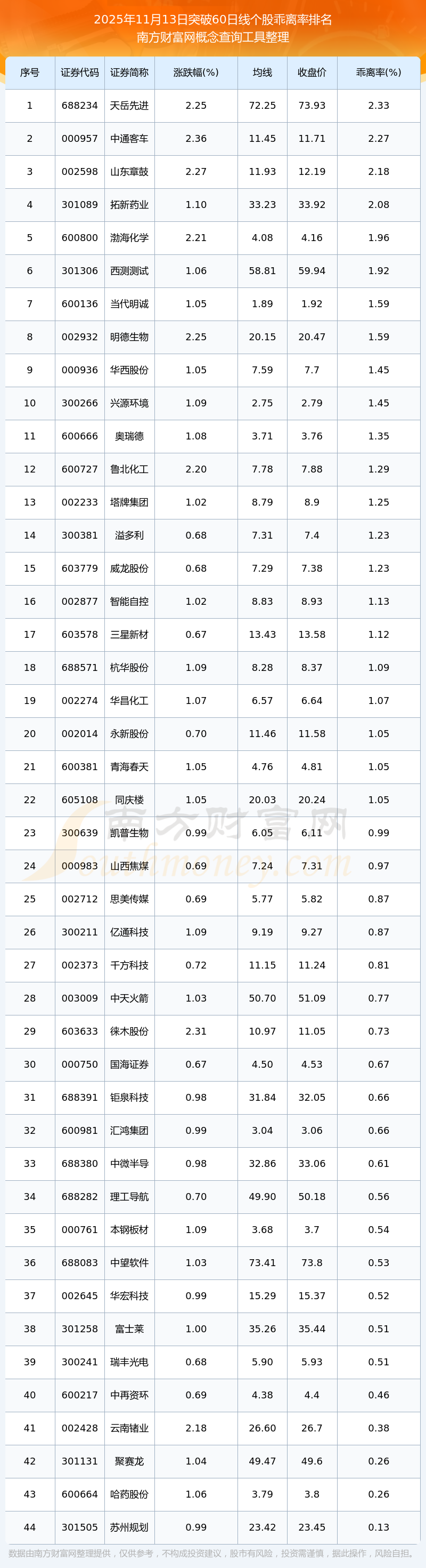根據(jù)南方財富網(wǎng)概念查詢工具數(shù)據(jù)統(tǒng)計,截止2025年11月13日收盤,共有44只個股收盤價向上突破了60日線,其中乖離率較大的個股有天岳先進(jìn)、中通客車、山東章鼓、拓新藥業(yè)、渤;瘜W(xué)等,乖離率分別為2.33%、2.27%、2.18%、2.08%、1.96%。