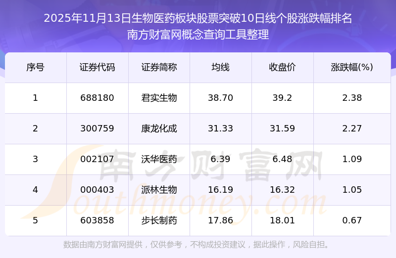 2025年11月13日生物醫(yī)藥板塊股票突破10日線(xiàn)個(gè)股漲跌幅排名