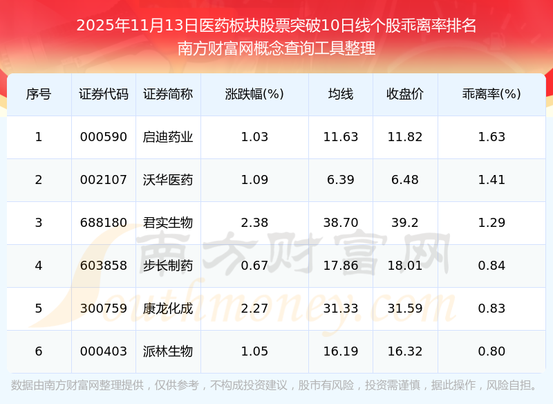 根據南方財富網概念查詢工具數據統(tǒng)計,截止2025年11月13日收盤,醫(yī)藥板塊股票共有6只個股收盤價向上突破了10日線。其中乖離率較大的個股有啟迪藥業(yè)、沃華醫(yī)藥、君實生物等,乖離率分別為1.63%、1.41%、1.29%。